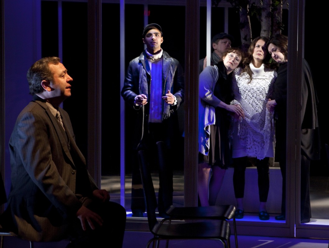 Dressed in a three-piece gray suit, Mr. Mann is a middle-aged, middle class family man with a job in the city. After a day at work, he returns to his middle class home, albeit an empty one, greeted by a series of Post-It notes rather than a family. His wife, Claudette (Caroline Gillis) has put leftover chicken in the fridge for him, which his son, Quentin (Shawn Ahmed) has eaten (and has apologized for, via Post-It). Mr. Mann has won two tickets, in an office draw, to a modern version of Anton Chekhov's The Three Sisters, which he decides to see alone after stopping by his empty home and finding no companion for the evening. He has no idea, upon entering the theatre, how the production will affect him, or how it will lead him to re-examine his life.
