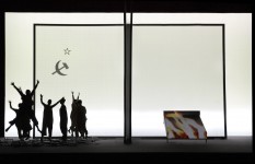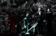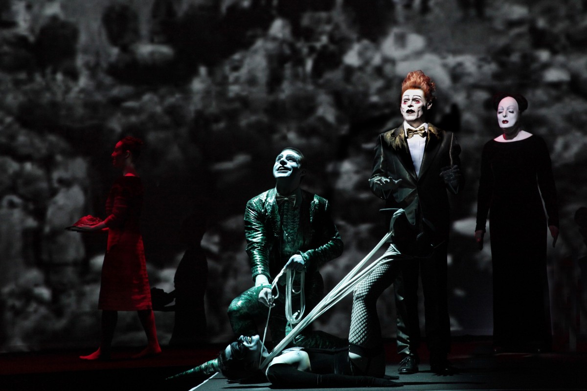 The stylish production opens with three Marina look-alikes lying in identical coffins while a pack of dobermans prowl the stage sniffing and biting at a scattered pile of bones. A manic Dafoe counts off the years of Abramovic's life, listing each defining moment and eventually piecing together a picture of who she is today. The show also features the haunting vocals of Serbian singer Svetlana Spajic, and an ensemble of supporting performers in costumes by Jacques Reynaud, each a work of art in his or her own right.
