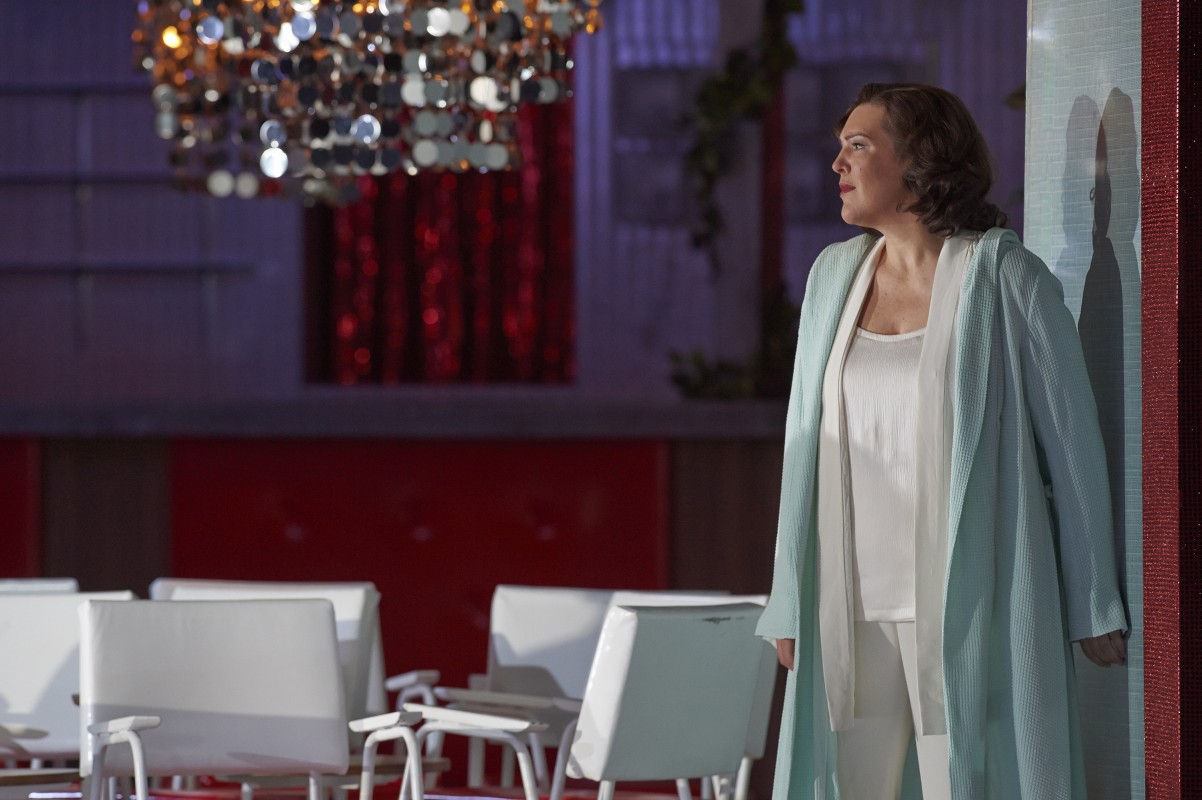 The piece opens with Oscar (Simone Osborne) playfully inspecting the “ballroom” which looks like a 50s style social club. Enter Riccardo (Dimitri Pittas), a political figure who is presented as a leader who understands the common man and is beloved by those he leads. Immediately within act one we see that while on the surface Riccardo appears to be light hearted and worry-free, it is quickly revealed that he has fallen in love with Amelia (Adrianne Pieczonka), the wife of his dearest friend Renato (Roland Wood). It is clear that he is truly conflicted over his feelings of loyalty but is also tortured by his desire. To add to this immense internal turmoil, Renato warns Riccardo of a plot against his life which Ricardo promptly dismisses. He turns the threat into a joke by using the information to test Ulrica (Elena Manistina), an oracle who’s ability to see the future has come under suspicion so much so that she is facing banishment.
