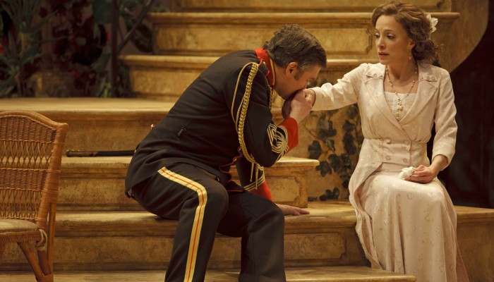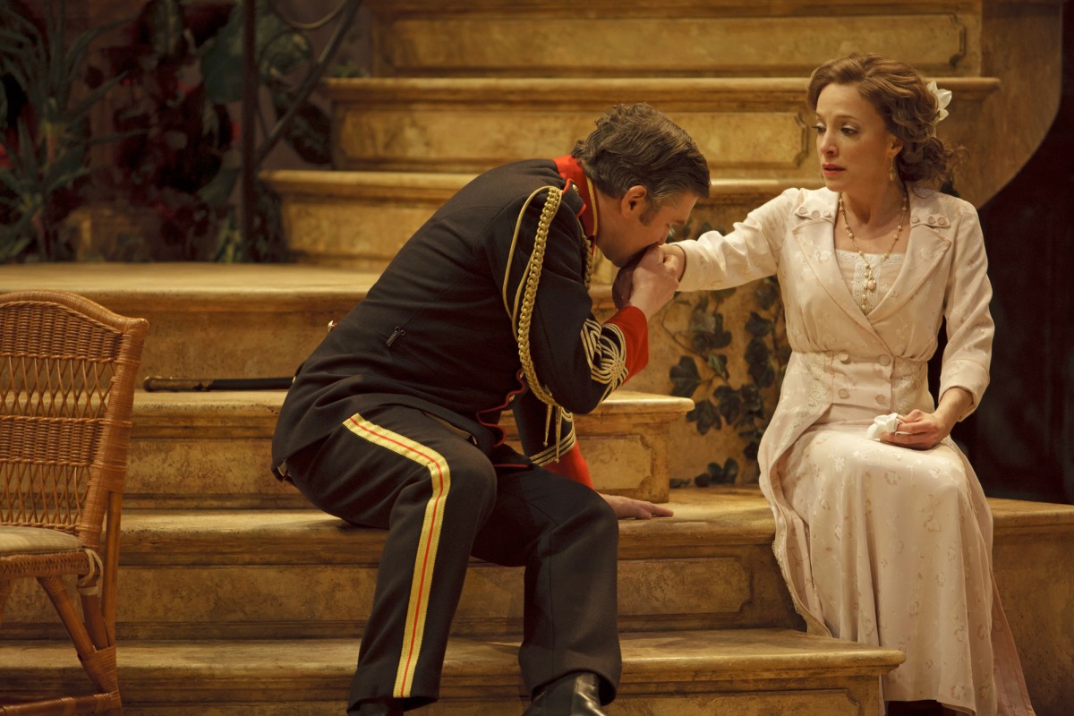 Stratford’s current staging of Much Ado About Nothing, directed by Christopher Newton, puts an exotic spin on Shakespeare’s famous romantic comedy. Set in Brazil around the turn of the 20th century, the modified production features a beautiful set with a sweeping staircase (by designer Santo Loquasto) on which the story about two very different pairs of lovers unfolds.
