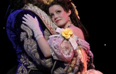 A cast of familiar characters is subsequently introduced— the brutish, conceited Gaston (Matt Farcher), clown-like Lefou (Jimmy Larkin), and Belle's lovable inventor father, Maurice (William A. Martin). The scenes are very true to the Disney film, with the dialogue taken directly from the script in some cases. However, Belle's lamentation to Maurice about the fact that she feels “odd” among the townspeople is unique to this production, and it leads Maurice to reminisce about when he met Belle's mother and how it changed his life. This scene allows the audience a glimpse both into Belle's past and her relationship with her father.